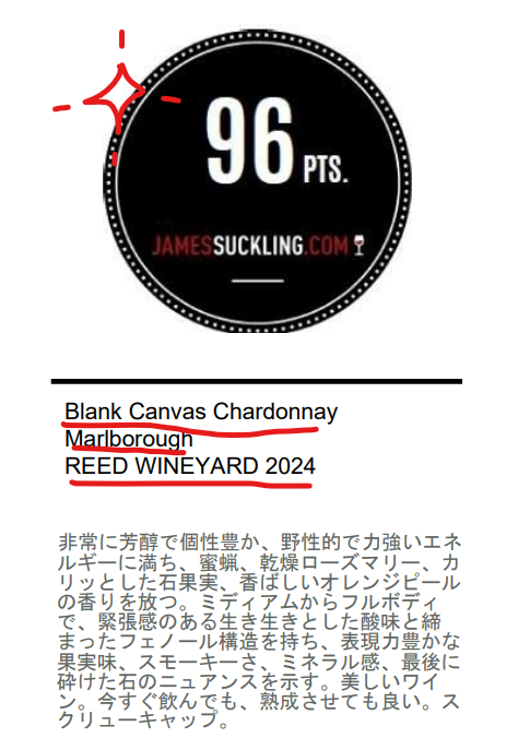 ・ブランク・キャンバスの リード・ヴィンヤード シャルドネ 2024が、ジェームス・サックリング氏の最新週刊レポート”New Zealand’s Top Vineyard 100″にて96点の評価を受けました。